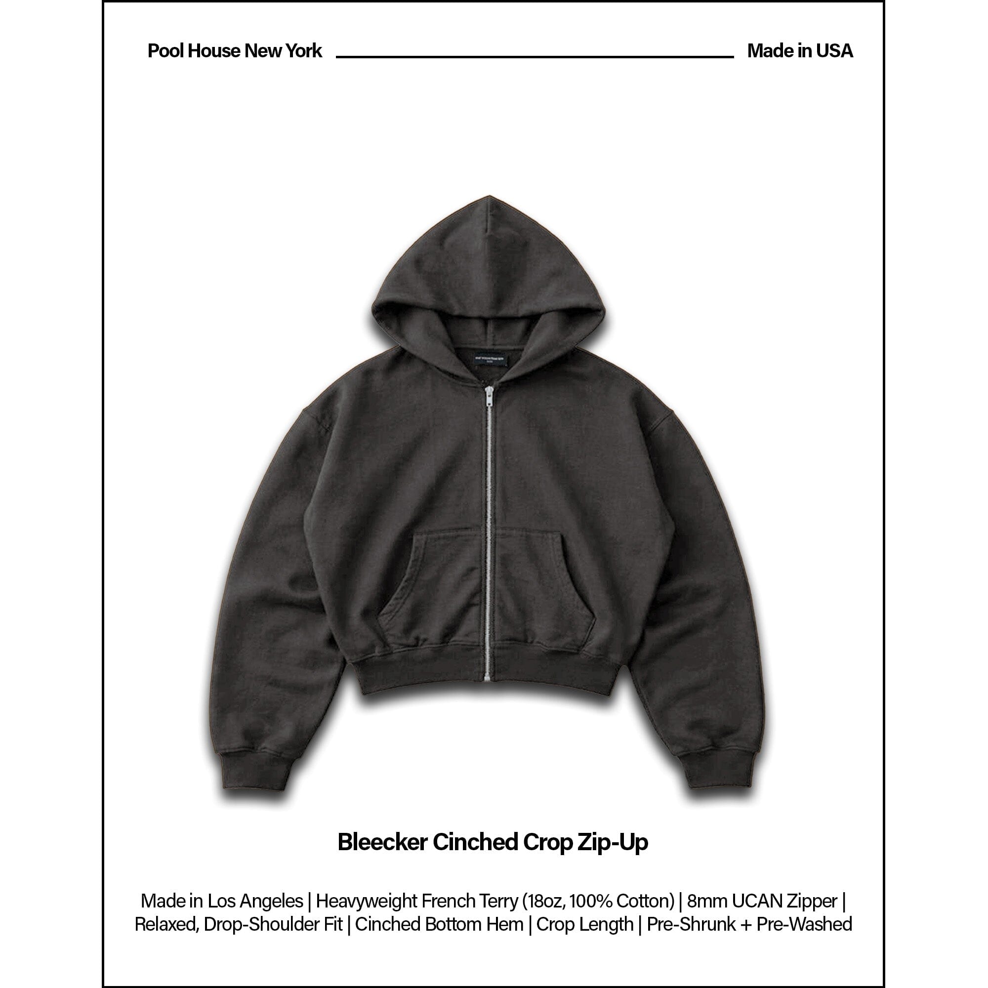 The Bleecker Cinched Crop Hoodie features a relaxed, drop-shoulder silhouette with a cropped length that falls just below the belt line. The adjustable cinched bottom hem lets you fine-tune the length — wear it slightly cropped for a sharper look, or lower it for a more relaxed look.