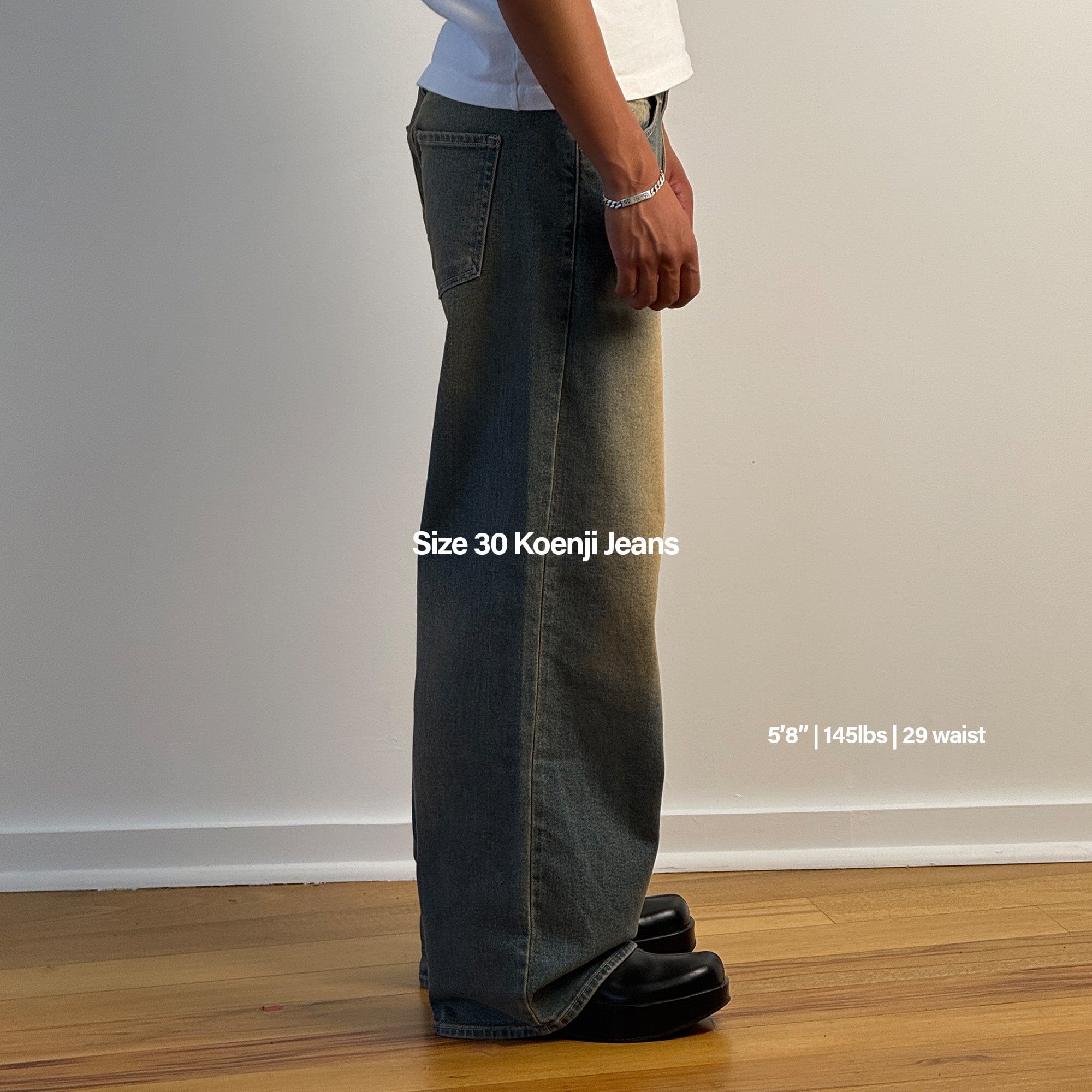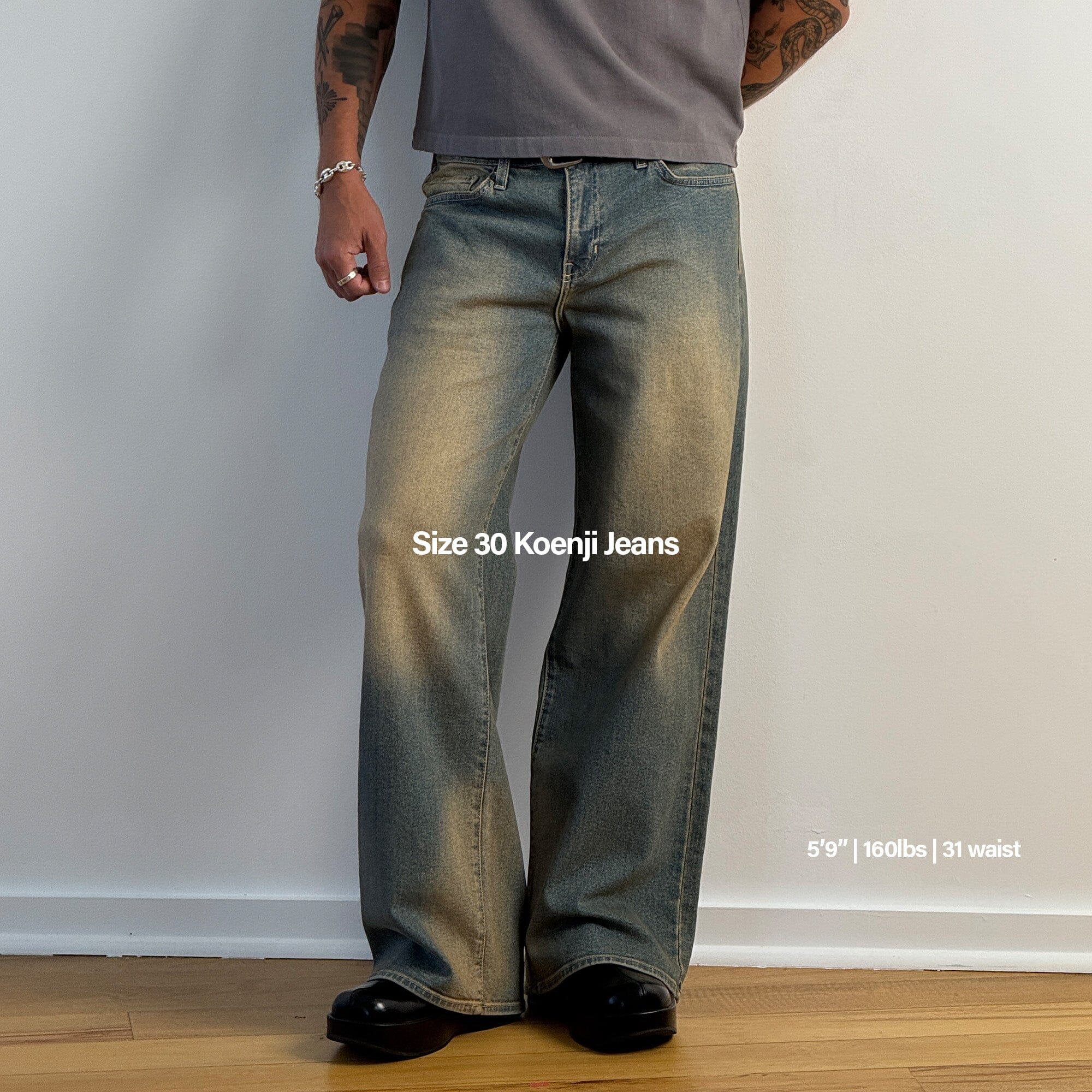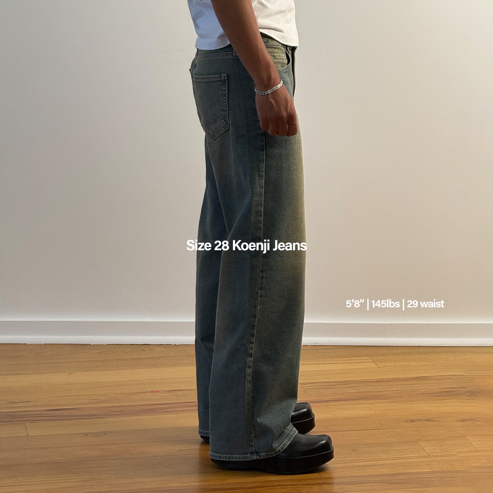 * Runs large because our Koenji Jeans have a low rise fit, designed to sit at your hips. For a straight-cut, size down one (1) size. For a wide-cut, go true to size.